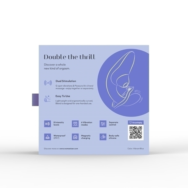 吸引と振動をダブルで楽しめるウーマナイザー!吸引強弱は8段階、振動パターンは6種類搭載。 完全防水なのでバスルームでも使用可能。 使用後は丸洗いでき、衛生的に使用できます。 独立した2つのモーターにより、吸引と振動を同時に、または別々で楽しむことができます。 吸引と振動、ダブルの刺激によるオーガズムを「ブレンドオーガズム」と言いますが、このウーマナイザーブレンドはまさにブレンドオーガズム初心者の方にぴったりなアイテムです!●カラー:ヴァイブラントブルー ※こちらの商品は受注発注商品の為、ご注文から発送までに3、4営業日掛かる場合が御座います。