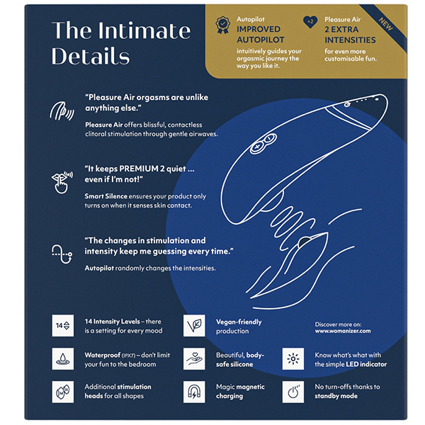 リアルなオーラルセックスでは体験できない快感が味わえる「ウーマナイザー プレミアム2 (ブルーベリー)」。 従来品からパワーアップした本作では、ボタンを押さなくてもお肌に当てるだけで吸引が自動でスタートする「タッチセンサー」を搭載♪お肌から離すと吸引も自動でストップするので、ボタン操作に慣れていない人でも感覚的に楽しめます。 また、強弱3段階の「パイロットモード」も搭載しているので予測できない楽しみを味わいたい!という人にもおすすめ。 ボタン操作をしなくても吸引の強弱を自動でコントロールしてくれるので、ゆったりとラグジュアリーな時間を楽しみたいときにも最適♪吸引強弱機能は12から14段階へ!素材はシリコン/ABS樹脂で2時間のフル充電で連続4時間の使用が可能です。