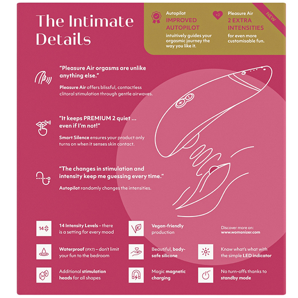 圧倒的な人気を誇るウーマナイザープレミアムが2へバージョンアップした「ウーマナイザー プレミアム2 (ラズベリー)」!強弱12段階から14段階へパワーアップし、従来の吸引バイブに新たに「タッチセンサー機能」と「パイロットコントロール機能」を搭載。 タッチセンサー機能では煩わしいボタン操作は必要なく、シリーズの中でも圧倒的に使いやすくなりました♪お肌に近づけると自動で吸引し、離すと自動でストップ!これならボタン操作に不慣れな人でも安心♪さらに予測できない楽しみを味わいたいという方のために弱・中・強3段階のパイロットモードを搭載。 ボタン操作をしなくてもウーマナイザーが自動で吸引の強弱をコントロールしてくれるので体感をじっくり味わいたいときに最適です!素材はシリコン/ABS樹脂で2時間のフル充電で連続4時間の使用が可能です。