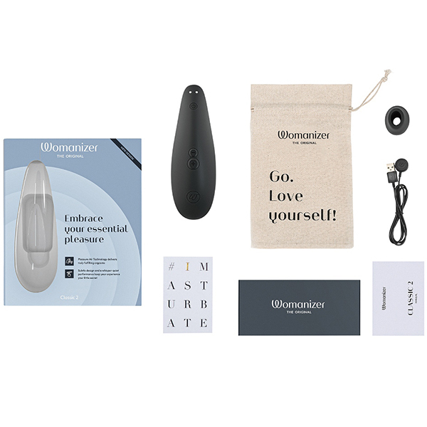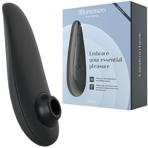 従来のバイブとは違い、クリトリスを吸うことを目的とした人気のトーイ・ウーマナイザーから入門用が登場!その名も「ウーマナイザー クラシック2 (ブラック)」。 プレミアムほどの高性能は要らない、でも高級感は失いたくない!そういう人のために登場したのが本作です。 これから初めてのウーマナイザーを楽しむのに最適!吸引部は柔らかな肌触りの良いシリコンとなり、吸引強弱も8から10段階へ。 オーガズムに達したときに電源ボタンを押すことで最弱の吸引力になる「アフタグローフューチャー」という新機能も搭載♪これによりイッたあともいきなりブツッと切れることなくゆったりとした余韻を楽しむことができます。