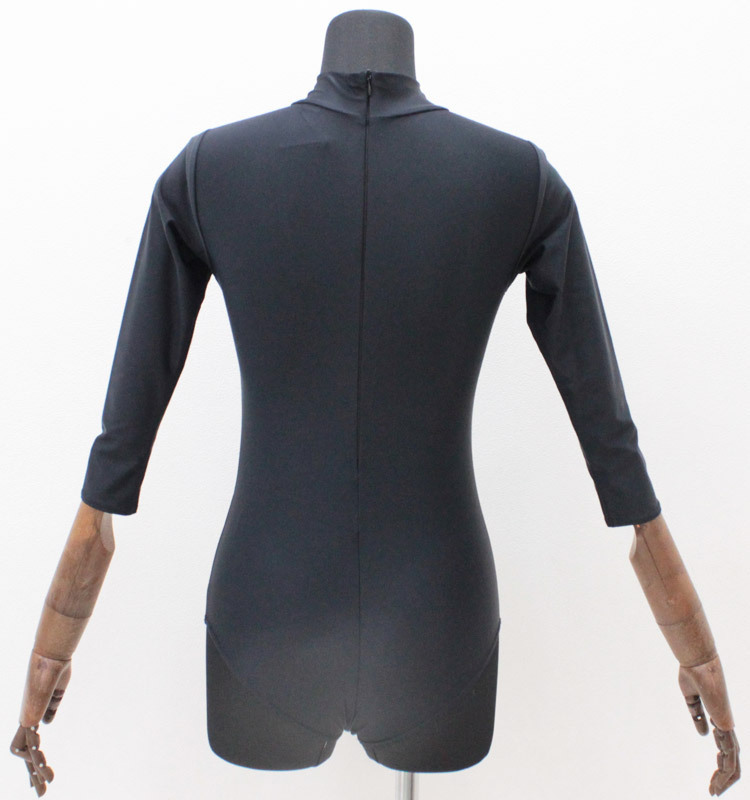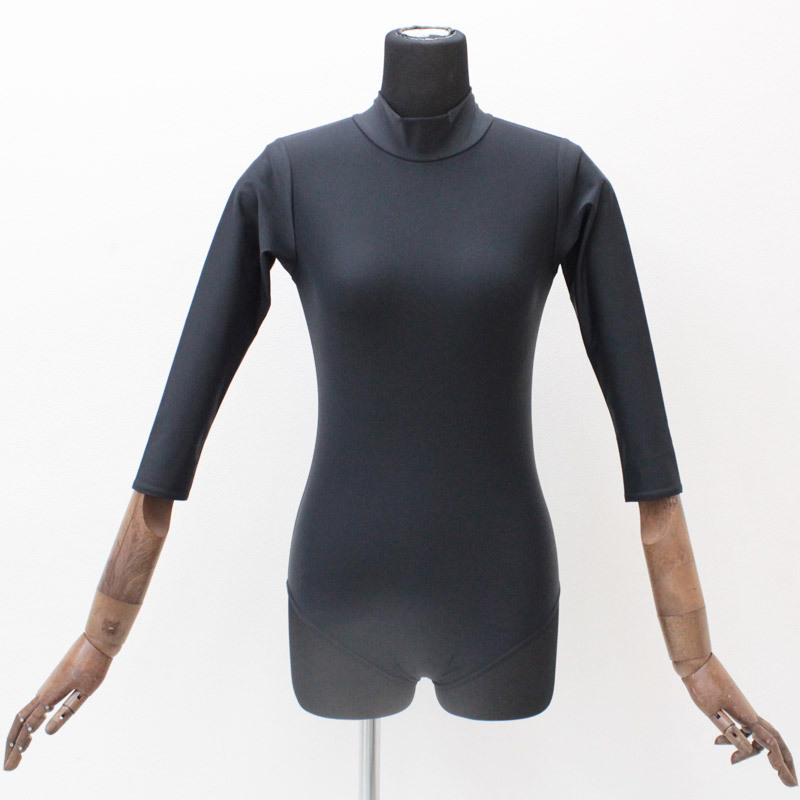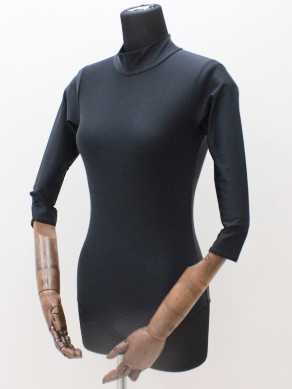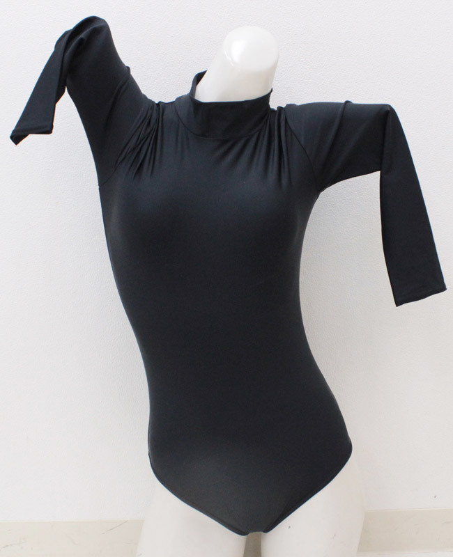 柔らかで伸縮性のある生地を使用した、ブラックカラーのシンプルな七部袖丈ハイネックレオタード(単品)。 お肌にピタッとフィットしながらも、締め付けすぎず自然な着心地。 美しいボディラインを強調する、ちょっぴりセクシーなコスプレ衣装です。