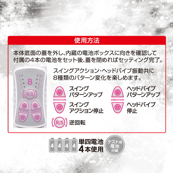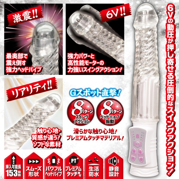 6Vの激震がGスポ直撃!中イキ派唸る悶絶必至の電池式バイブ(白)。 内蔵された高性能モーターが繰り出すハイパワー振動!8種類のスイングと振動パターンに加えて、刺激の変化をもたらすリバース機能で飽きの来ない多彩なアクションが楽しめる♪挿入可能長は153mm、滑らかで触り心地の良いプレミアムタッチ採用!最奥を徹底的に責め立てるストレートバイブ。 単4電池×4本使用