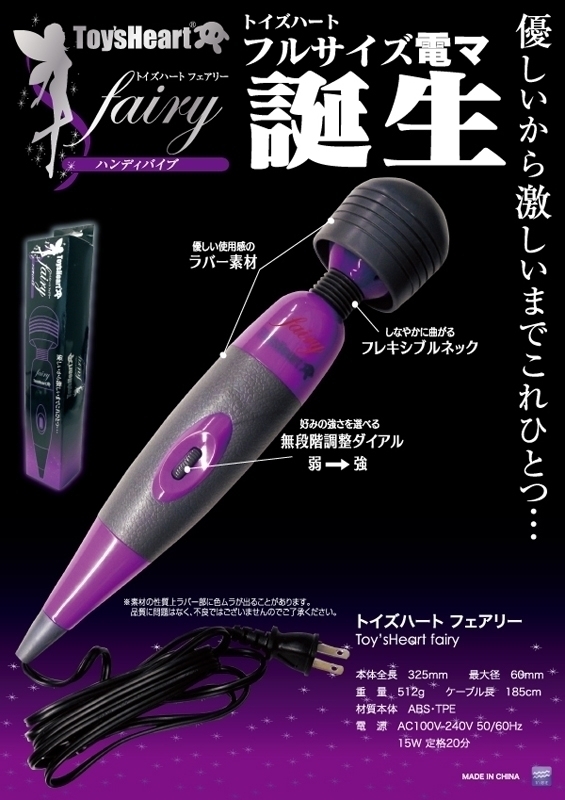 電マで人気のフェアリーが黒×紫に!トイズハートブランドのロゴを冠して登場です。 色違いでラグジュアリー感が増したかも?!女性のオナニーやパートナーの責め具として定番の白×ピンクタイプと同じ性能。 振動パワーが落ちないAC電源・ダイヤル式無段階調節・しなやかで当てやすいヘッドなど、使用感は折り紙つき!こだわりの詰まった電マです。