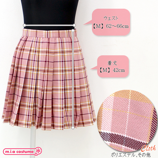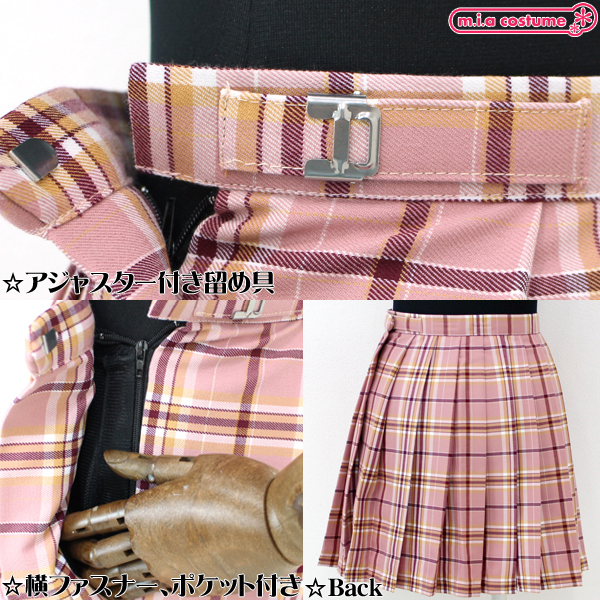 自分流にアレンジして制服コーデを楽しもう!ピンク×キャメルの可愛いチェック柄プリーツスカート単品。 ウエスト調節可能なアジャスター付き留め具付きで、サイドには横ファスナーとポケットが付いた機能性抜群の本格派デザイン♪現役学生さんのコーデアイテムとして、コスプレ衣装や制服コスと合わせても可愛い! ※色落ちの可能性があるので水洗い&塩素系漂白剤による漂白は不可 ※水洗い不可、塩素系漂白剤による漂白不可、色落ちの可能性があります。