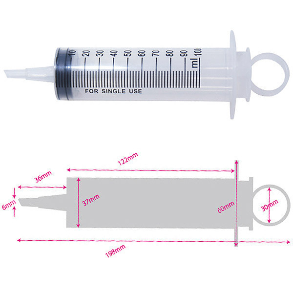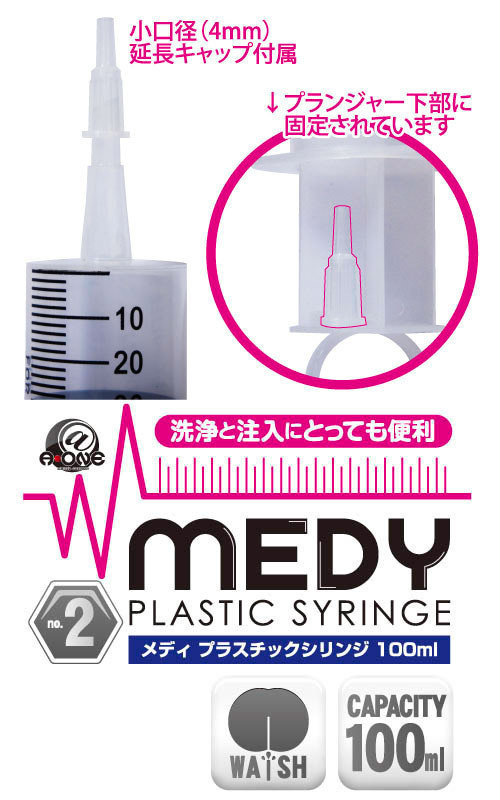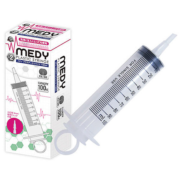 片手でもラクラク注入♪アナル洗浄や注入など、幅広い用途に使える万能プラスチック製シリンジ。 ●医療系グッズのMEDYシリーズ●お手軽なプラスチック製●容量たっぷりの100ml●注入量が一目で分かる目盛り入り●片手でも簡単に注入できるリング付き●小口径の延長キャップも付属。 付属の延長キャップを装着すれば、初心者の方でも使える小口径4mmに早変わり!延長キャップはプランジャー下部に固定されているので保管の際も安心です。