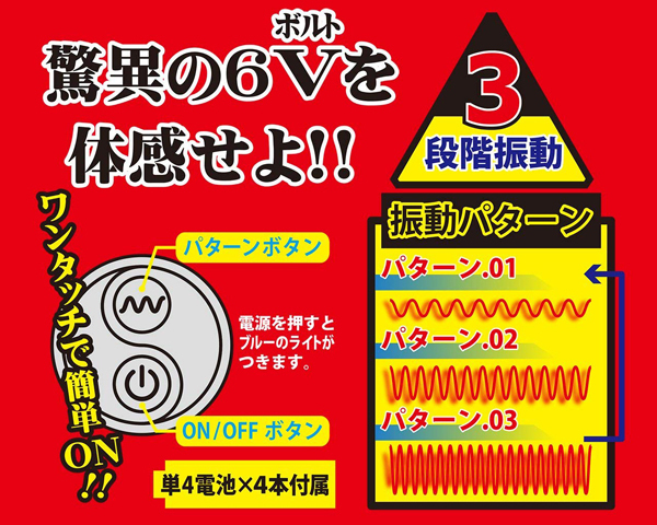 ボタンもワンタッチの簡単操作でシンプルに楽しめるブラックカラーのローターとなっております♪簡単な操作でパワフルな快感!6ボルトの振動を手軽に楽しめるシンプルなシングルローターで、振動パターンは強弱3パターンを内蔵。 シンプル構造のシングルローターだから、どなた様でも手軽に6ボルトの振動をお楽しみいただけます♪