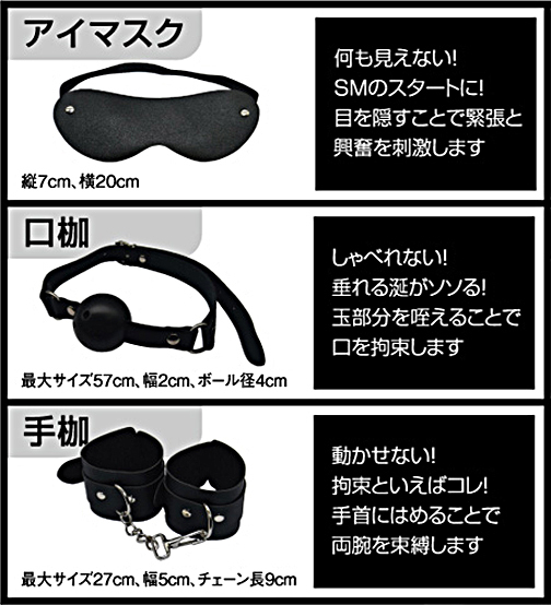 好きなあの子をいいなりに……。 これひとつでSMプレイを網羅する豪華8点セット!SMプレイをスタートしたい、ビギナーなアナタにぴったりなSMグッズセットです。視覚を奪って緊張感が高まる「アイマスク」言葉を塞いで垂れる涎がそそる「口枷」動きを束縛する本格派拘束「手枷」身を捩る動きが音を奏でる「乳首クリップ」叩いた音が嗜虐を煽る「バラムチ」。 SMプレイをすぐに始められる、厳選の全5アイテムです。