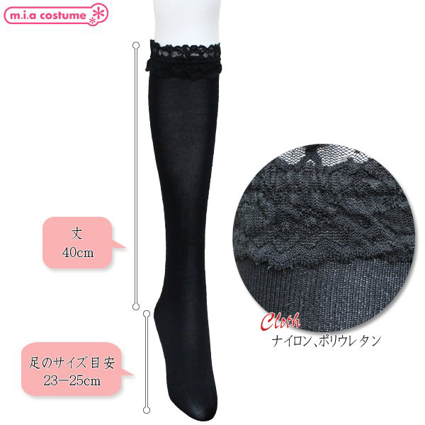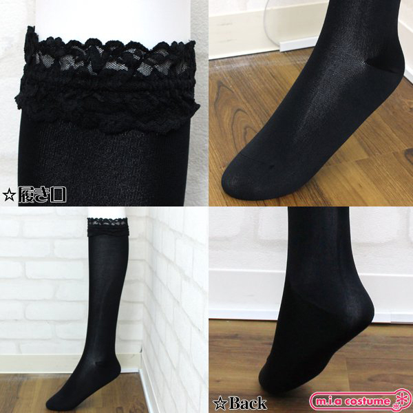 > 【50円★数量限定】ソフトナイロンレース付ハイソックス 黒 無地 40cm丈 23〜25cm<お一人様1点限り>