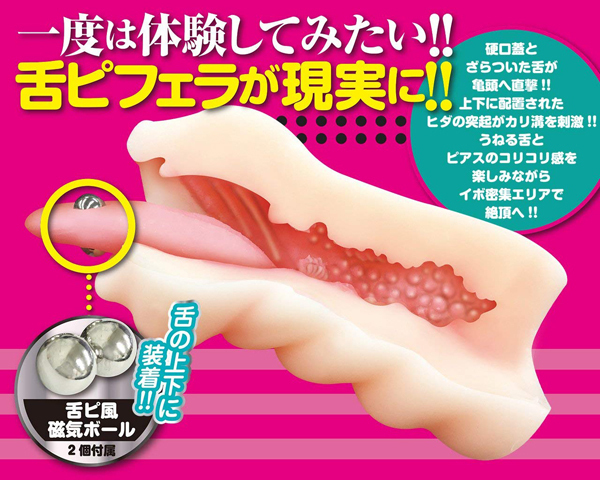 「舌ピフェラビッチ」が夢の舌ピアスフェラを体験できるオナホールとして登場!亀頭をコロコロ擦り上げるひんやりとした舌ピアスや着脱可能な磁気ボールがカリ溝に引っかかり、刺激を与えます♪柔らかな素材で、ハードなホールが苦手な人でも安心!磁気ボールは自由な位置に装着可能で硬口蓋とざらついた舌が亀頭へ直撃し、上下に配置されたヒダの突起がカリ溝を刺激♪うねる舌とピアスのコリコリ感を楽しみながらイボ密集エリアで絶頂へと導きます!まさに舌ピフェラビッチの魅力をたっぷりと味わえる非貫通型フェラホールです。