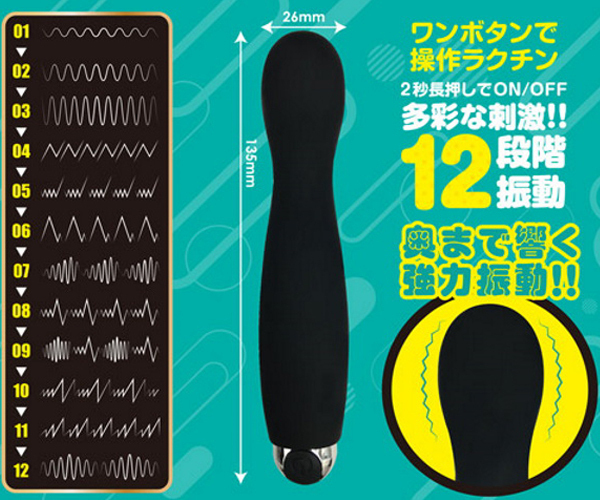 小型なのに奥まで響く強力振動!!12段階の振動パターンが多彩な刺激を生み出す。 ワンボタンで操作もラクチンだからプレイに集中できます。 <ブラック>シルクタッチな肌触りとスムーズヘッドが初心者にも安心の簡単挿入サポート!ボディ中腹が膨らんでいるので内部を圧迫して満たします。 ●上質なシリコン素材●ワンボタンで楽々操作●生活防水機能●USB充電式