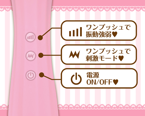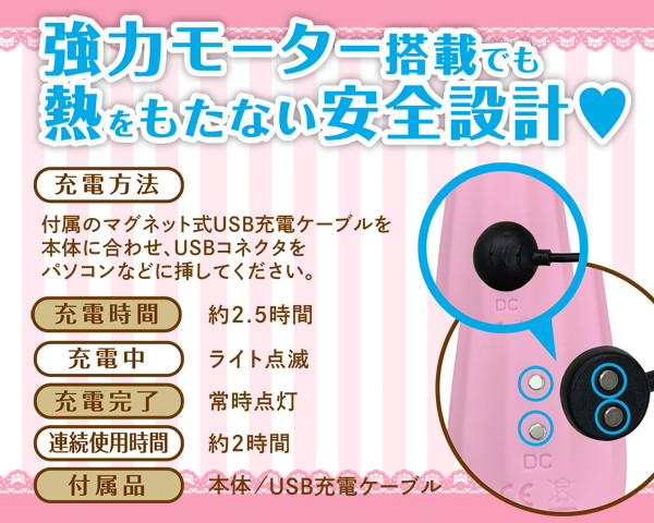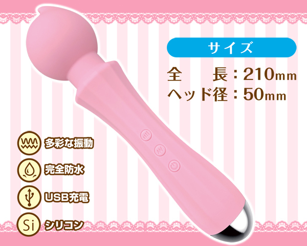 スレンダー美人なグラドルAV女優「吉高寧々」も身悶えたキュートなピンクカラーのUSB充電式電マ。 出っ張った先端がピンポイント刺激に対応!クリや乳首を責めると同時に周囲までしっかり振動を伝えます。 素材には柔らかなシリコンを採用、振動は5種類のパターンと3段階強弱を搭載!超強力モーターが生み出す快感を貴方も体験しよう♪完全防水、2.5時間充電で2時間連続稼働