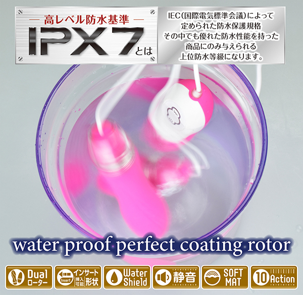 なんと30分間水没させても浸水しないという、国際基準IPX7をクリアした驚異の防水性能を誇るダブルローターです。 挿入して楽しめるインサートスタイルと、ピンポイントに当てて楽しめるスポットスタイルのヘッドは、それぞれ形が異なるのでクリに当てながら挿入したりといった使い方も可能♪振動パターンは10種類でトルクフルな強力振動はきっとクセになること間違いなし!肌触りの良いさらさらマット加工は、女性が心地よく感じること請け合いで、最新技術のウォーターシールド加工が施されているから、本体もコントローラーも水に入れても浸水しませんよ♪こちらはシックなブラックカラーになります。