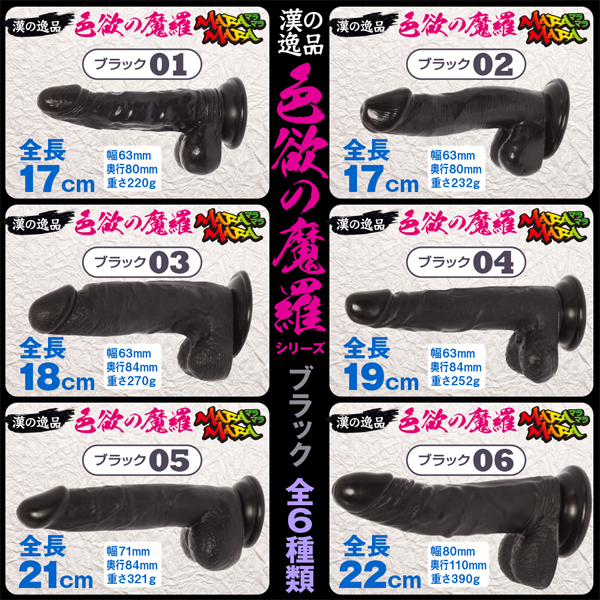 maccos japanのディルドブランドMARAMARAから【色欲の魔羅シリーズ】の登場です。 少しワインディングしたサオのフォルムが特徴で、カリの張り出しも強めで、引っ掛かりが心地よいタイプ。 全長17cm、最大径3.9cm、挿入長12cm。 ブラックカラーの色欲に溺れるリアルな外観と感触がたまらない!本物志向のスタンダードなディルドです。 02は先端が大きく、ピストンでの掻き回しに最適。 適度な弾力と硬さを兼ね備え、本物以上の質感は貴女を虜にすることでしょう。 床、壁、浴槽とどこにでも張り付く強力吸盤付きで楽しむ場所を選びません。 初心者から上級者までしっかりと楽しむ事が出来ます。