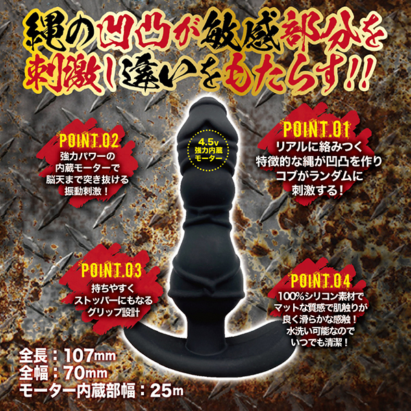ペニスが緊縛されているような独特の形状の挿入シャフト、そして強弱を含んだ10種類のバイブレーションで穴の中を振動攻めしてくれる「メスイキ クレイジージャンキー (緊縛)」です。 敏感な部分を強力な振動と独特な凸凹が刺激して悶絶必至♪4.5Vの強力パワー&10ファンクションシステム搭載&100%シリコンの強力イカセプラグ!抜き差しして楽しむも良し、挿れっぱなしでバイブ機能を堪能するも良しの優秀バイブです。