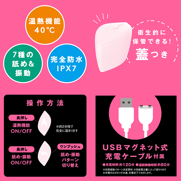 アツくて甘〜い愛のご奉仕クンニ_超!愛を感じる舐めローター!彼の熱い舌を思い出す温感機能は40℃まで温まる人肌温度_先っぽで刺激するチロチロクンニからグイグイ舐め上げる激しいクンニまで多彩なクンニが楽しめちゃう_さらに7パターンの振動機能付き!震えるあったかベロでとろける濃密前戯_やっぱりクンニがナンバー1!!!完全防水なので使用後のお手入れもラクチン♪敏感な部分に直接使うものだから、優しい肌あたりの高品質ソフトシリコンを使用しました。 衛生的に保管できる蓋付きです。 振動・舌舐め:7パターン&完全防水IPX7等級&充電用USBケーブル付属。 カラー:ピンク
