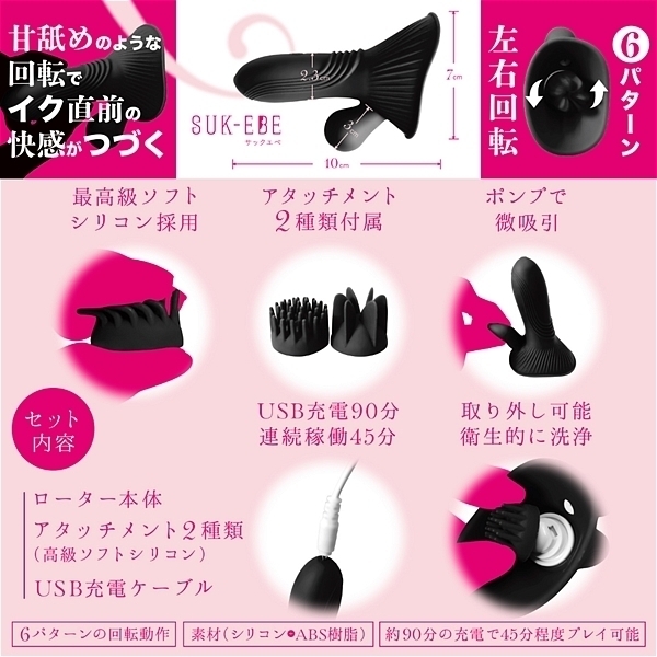 優しく舐めるから、イク直前の感覚がつづく。 それが「ヤバ回転ローターNEBURINGUS−ネブリングス−」です。 強い振動ばかりに慣れていると感度が鈍くなりませんか?今こそ優しくせつなく敏感な部分を「ねぶり」ましょう。 敏感なアソコも胸もどちらもOK!!最初に使うときはお好みのアタッチメントを装着してからご使用ください。 極限まで柔かくした高級シリコンブラシが優しく回転して刺激します。 (薄めのローションをつけると滑りが良くなります)焦らされるような独特の感覚が、オーガズム直前のもどかしさを再現。 左右回転6パターンで飽きさせません。 優しさを演出するために敢えて「微」吸引ポンプも設置。 ポンプのプッシュでもどかしい吸い付きが更なる焦らしを演出。 しかも交換用アタッチメントつきで楽しさ2倍。 【セット内容】ローター本体/アタッチメント(高級ソフトシリコン)/USB充電ケーブル。 滑らかな感触をお求めの場合はローションをご利用ください。 ・6パターンの回転動作・約90分の充電で45分程度楽しめます●タイプB