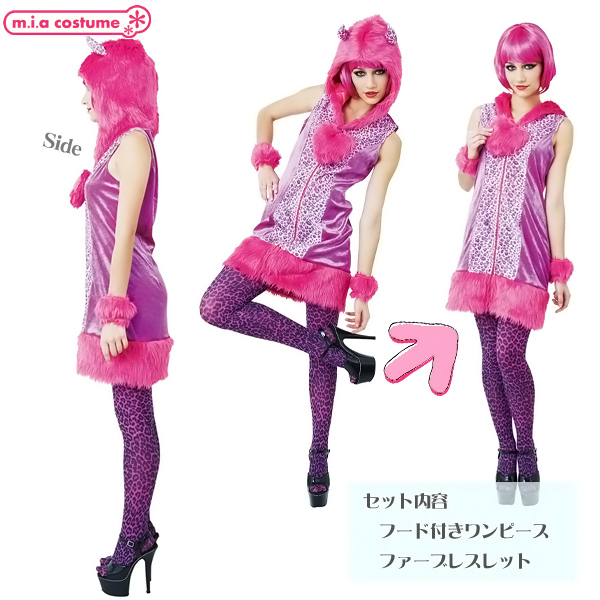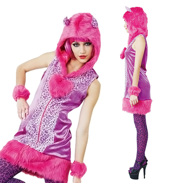人とかぶらない個性的なハロウィン仮装をお探しの方に!フューシャピンクのビビッドなカラーが注目度抜群な、可愛いヒョウ柄の悪魔コスプレ。 獣感のあるもこもこファーのフード付ワンピースとファーブレスレットで、全身をド派手にコーディネート!近未来から来たようなデザインが可愛いデビル仮装です。