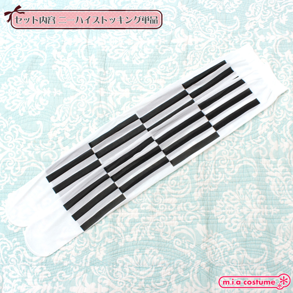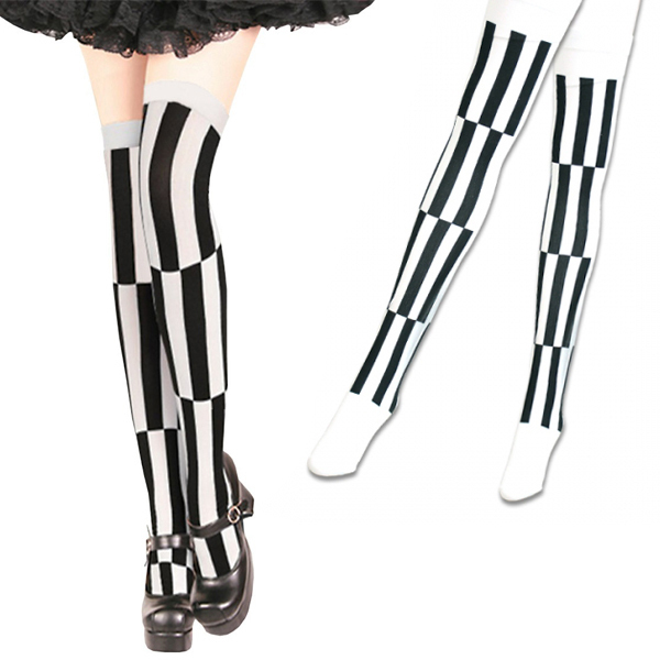 ゴシック&ロリータファッションと相性抜群!ブロック模様の白黒ストライプ柄ニーハイストッキング70cm。 個性的でお洒落なデザインで足元を可愛くコーディネートしよう♪コスプレやハロウィン仮装と合わせても◎ ※色落ちの可能性があるため、塩素系漂白剤での漂白&水洗い不可。